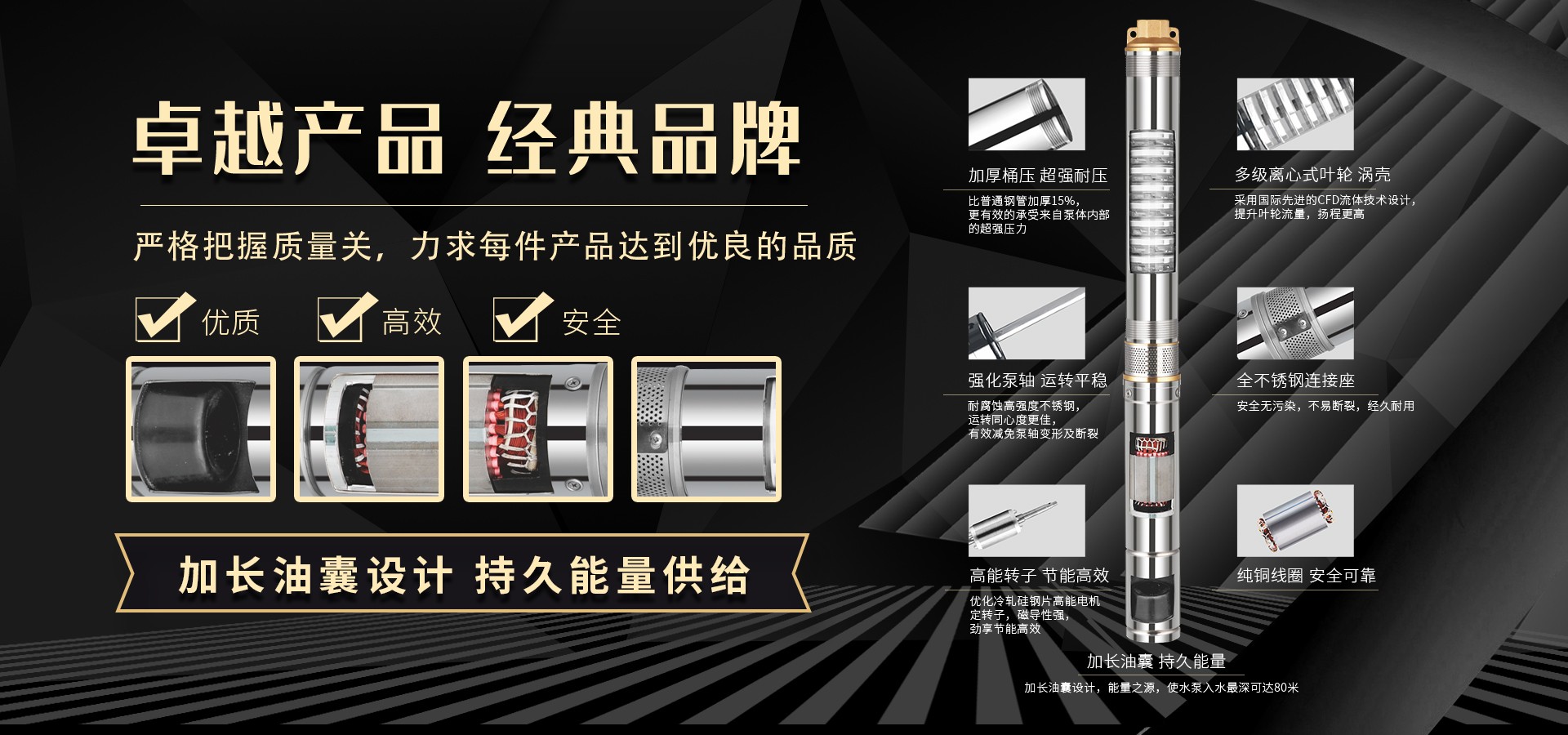 公司始終站在深井泵行業的前端位置,科研力量、產品和設備技術水平均達到國內優質水平,公司始終堅持走科技興企、自主創新的企業發展之路,產品不斷推陳出新,可廣泛應用于農業灌溉、生活用水、循環供暖、污水處理、市政供水、石油化工、冶金礦山等領域。
